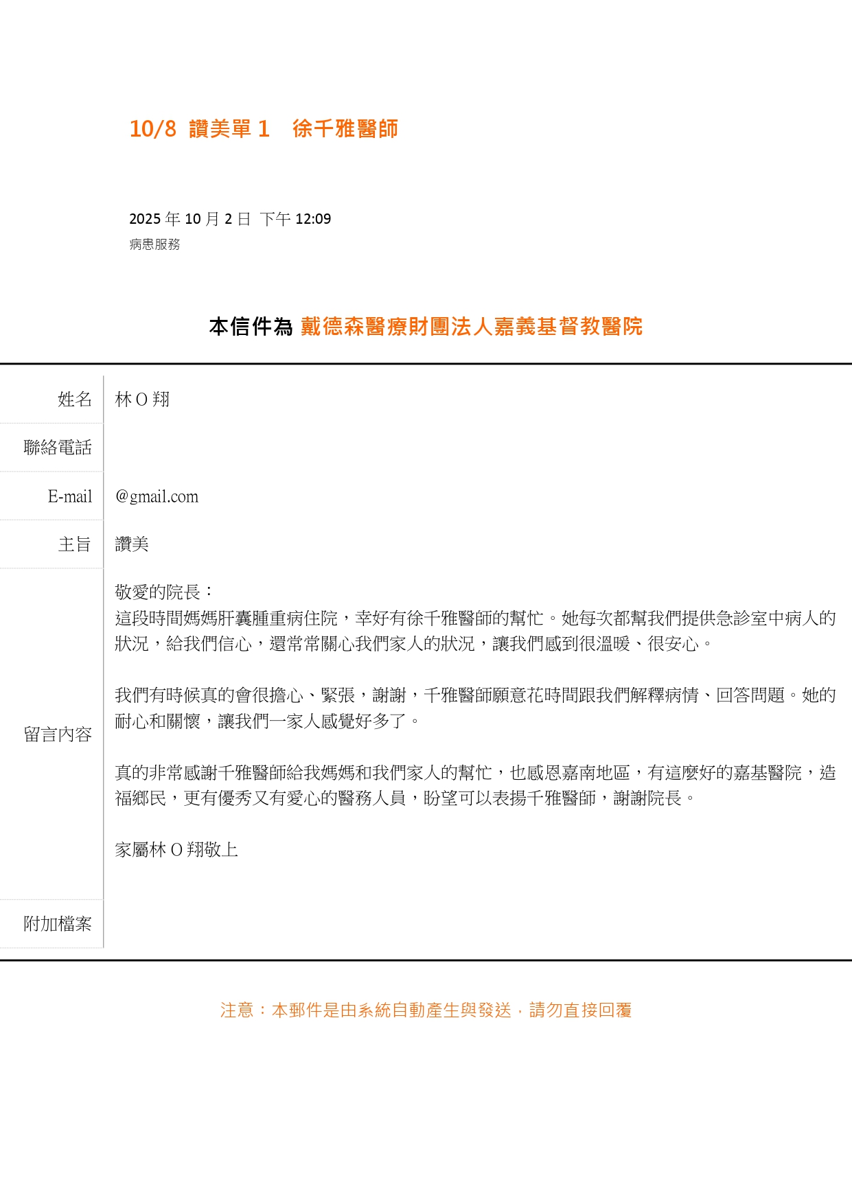 愛是永不止息- 來自家屬的肯定及感謝 嘉基 一般科徐千雅醫師【視病如親】