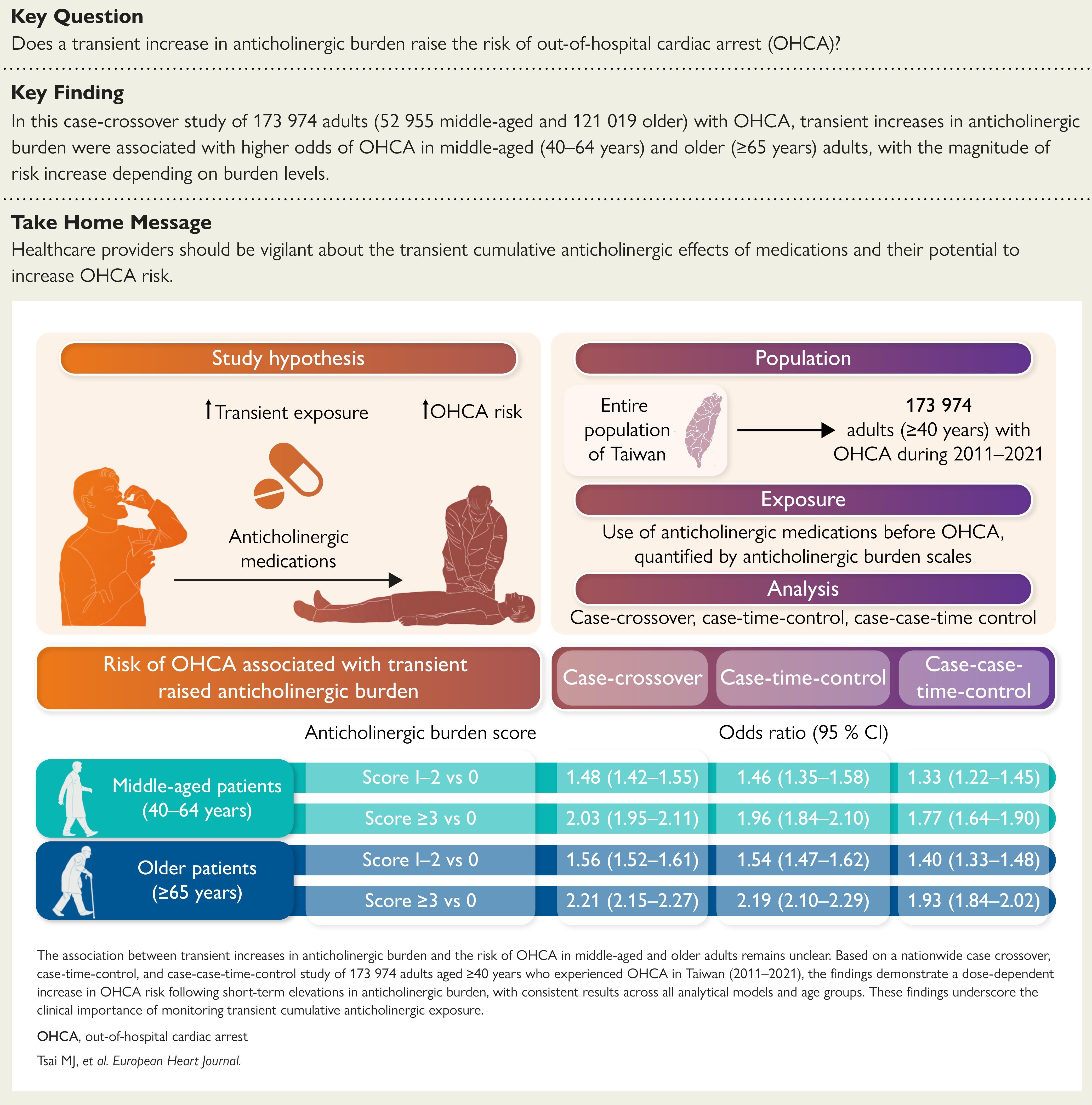 在日常生活中,許多人因過敏、腸胃不適、排尿問題或壓力調適而服用藥物,其中不少屬於具有「抗膽鹼作用」的處方。這類藥物能改善不適,卻也可能因副作用造成負擔。嘉義基督教醫院與國立成功大學共同發表最新研究指出,短期內累積使用多種具抗膽鹼作用的藥物,會顯著提高院外心臟驟停(OHCA)風險。此研究成果刊登於國際心血管權威期刊《European Heart Journal》,是目前全球同領域規模最大的研究,再度展現臺灣在臨床藥物流行病學上的研究能量。