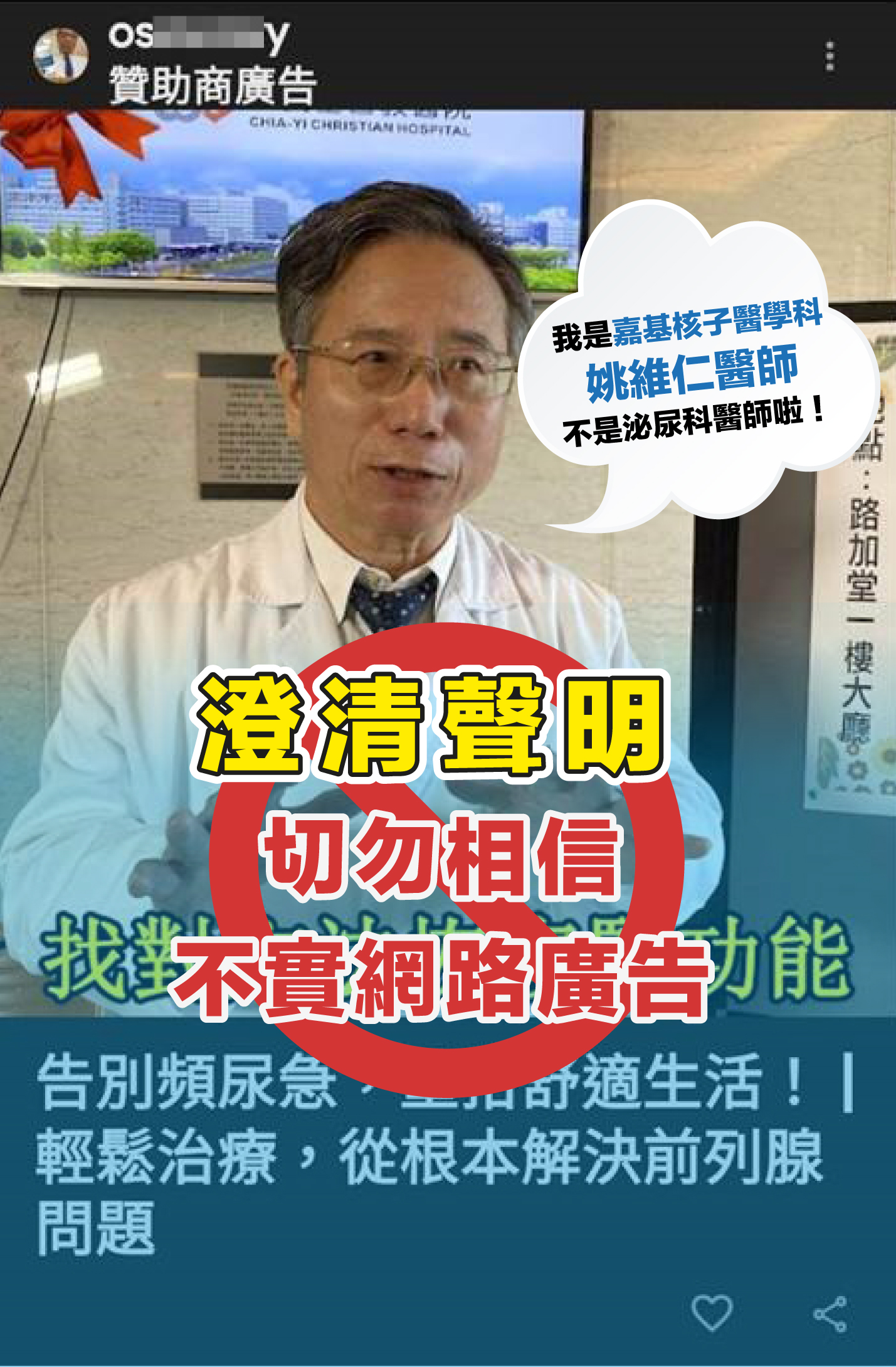 業者惡意擷取本院醫師的影片或照片,將其盜用於不明藥物、健康食品或醫療服務之廣告宣傳。