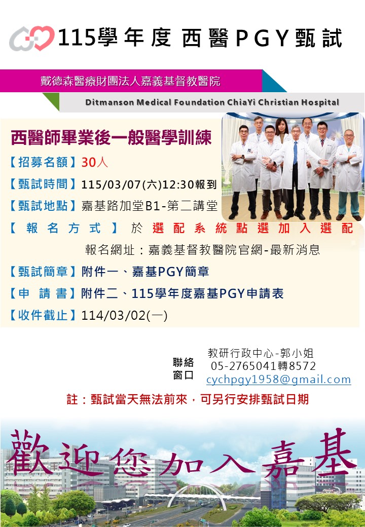 嘉義基督教醫院【115學年度西醫PGY 甄試】開始囉!