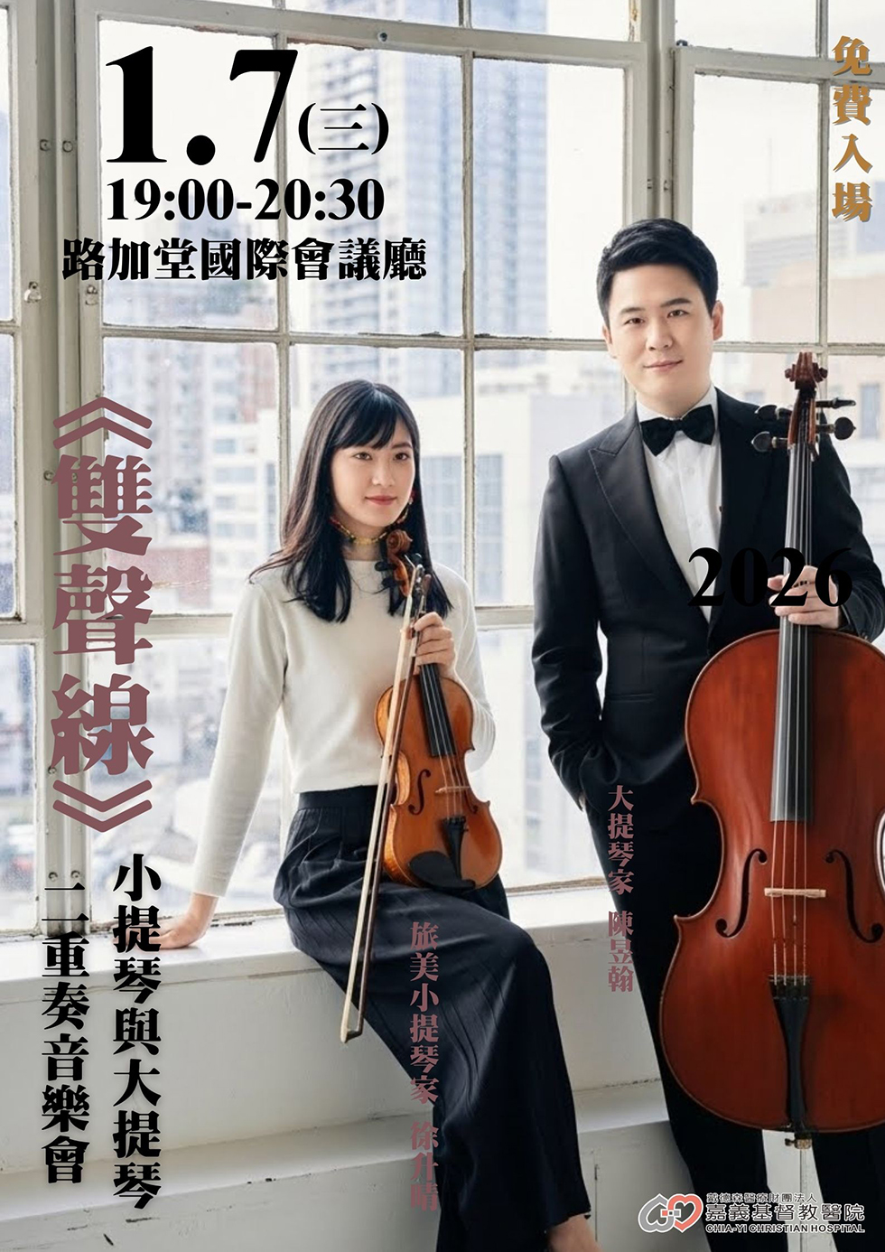 本場音樂會開放社區民眾參與,院內同仁免費入場,誠摯邀請您在新的一年開始,與我們一同走進音樂,讓心慢下來,讓美好悄悄發生。