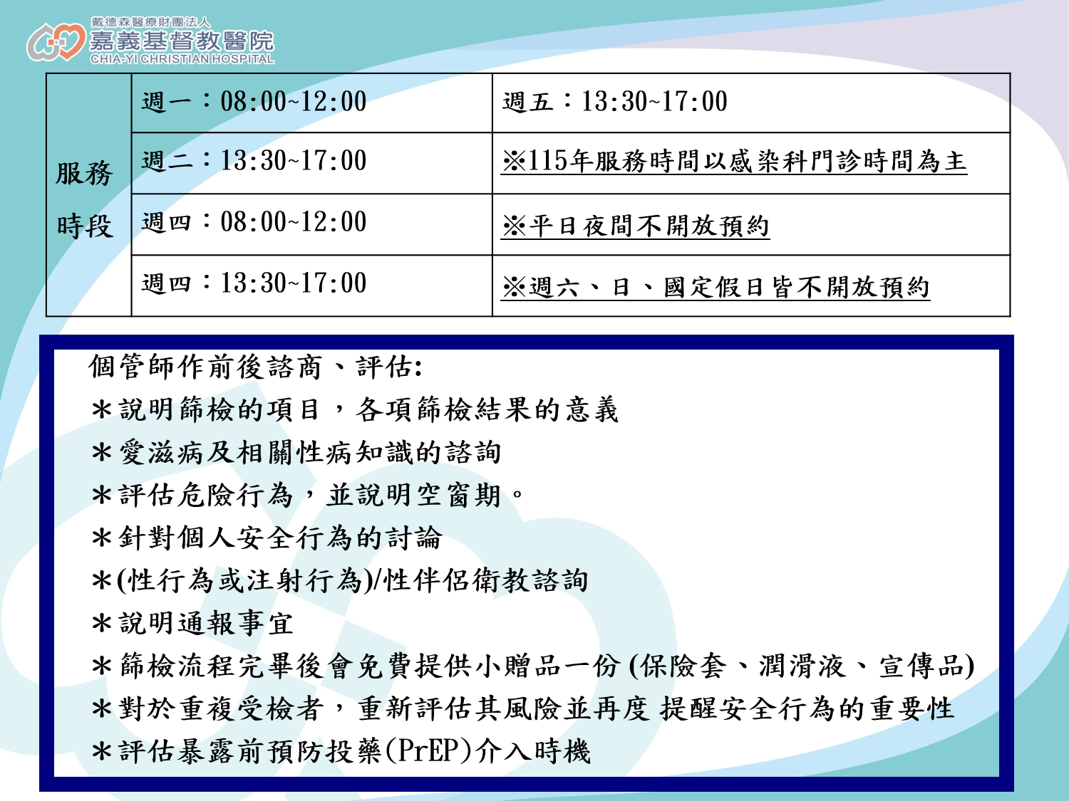 115年嘉基免費愛滋匿名諮詢篩檢服務流程