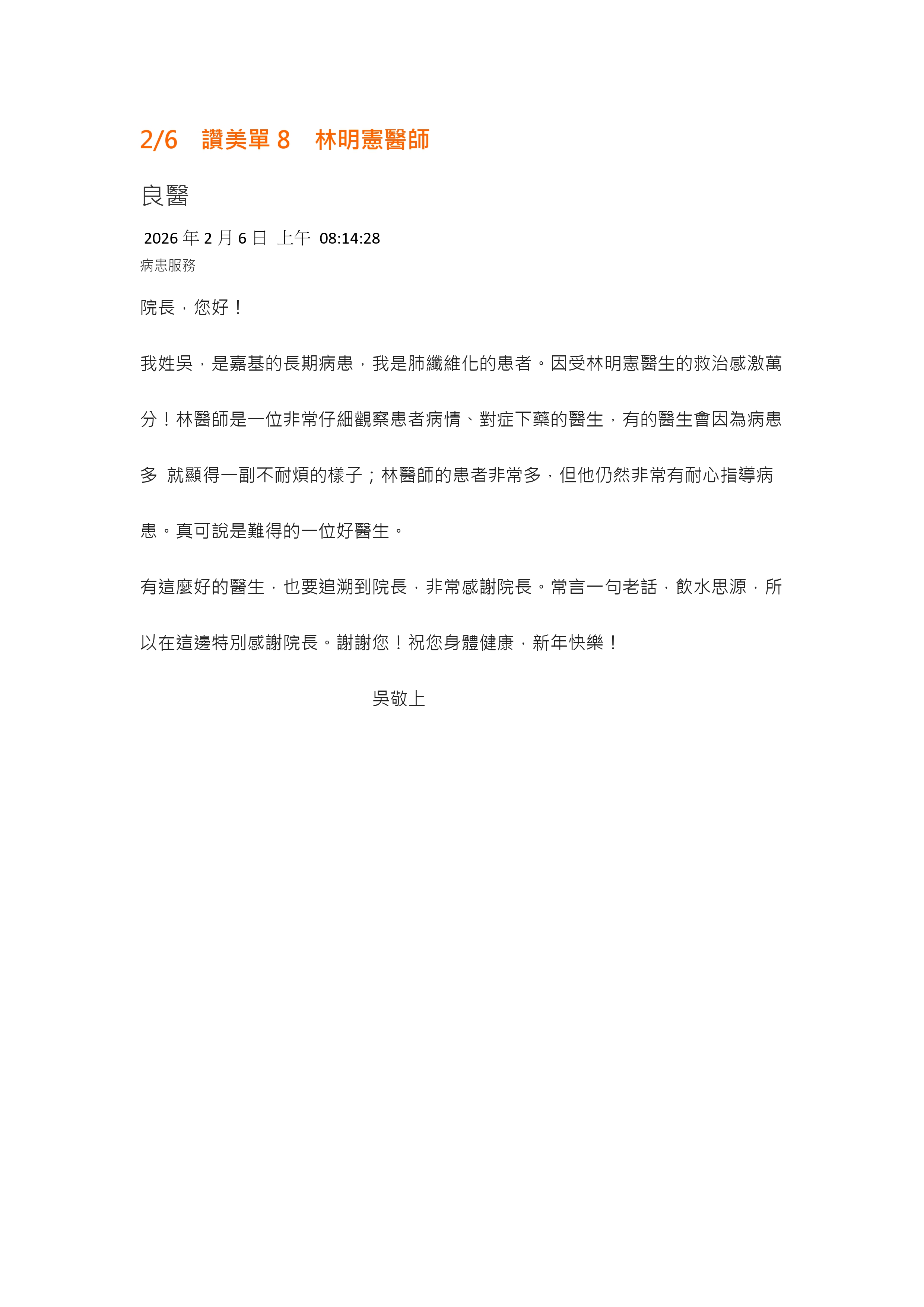 愛是永不止息- 來自病人的肯定及感謝 嘉基 胸腔內科林明憲醫師【仁心仁術】