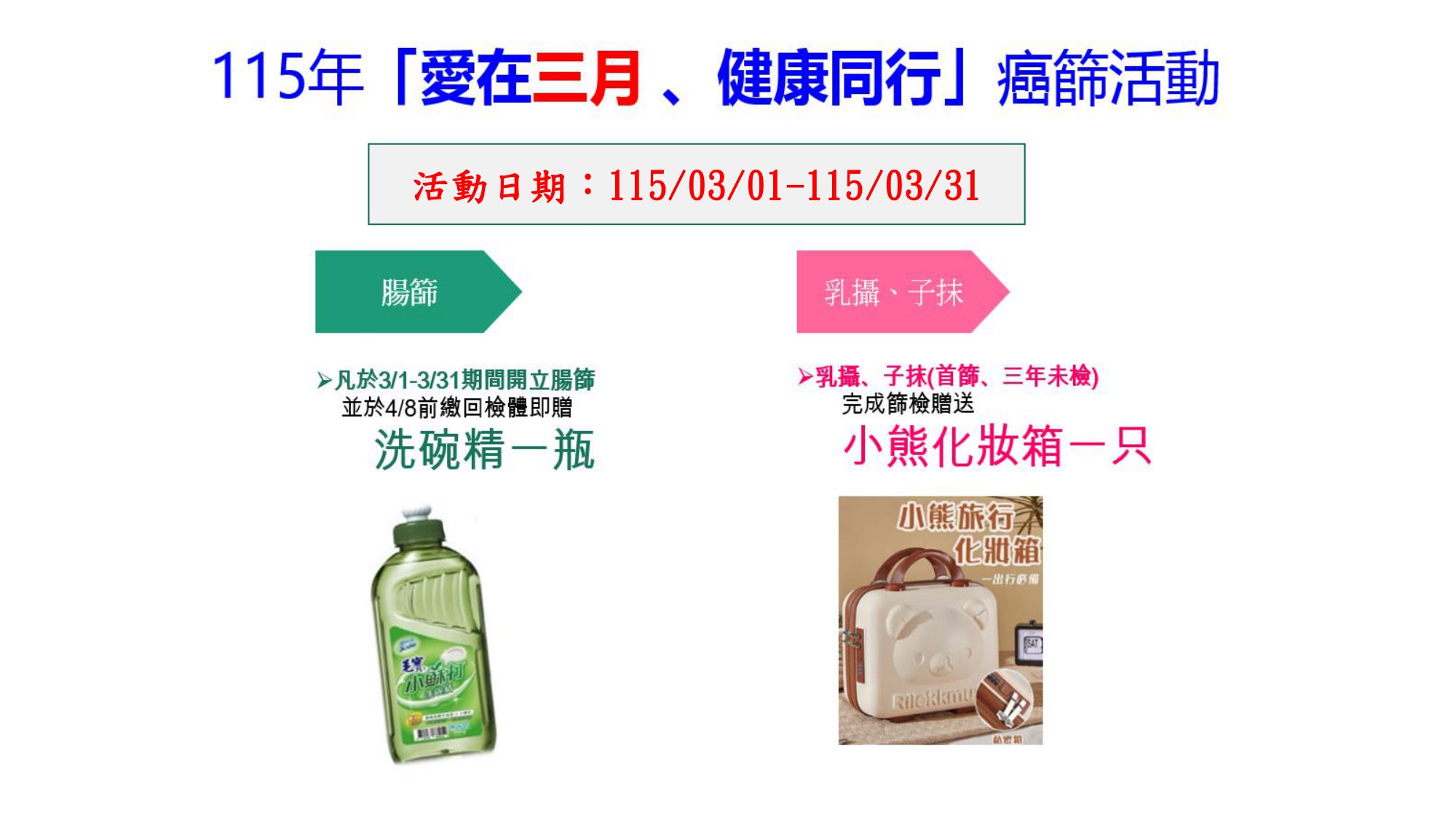 於活動期間在嘉基完成子宮頸抹片或乳房攝影,就讓妳帶走一只小熊旅行化妝箱喔!