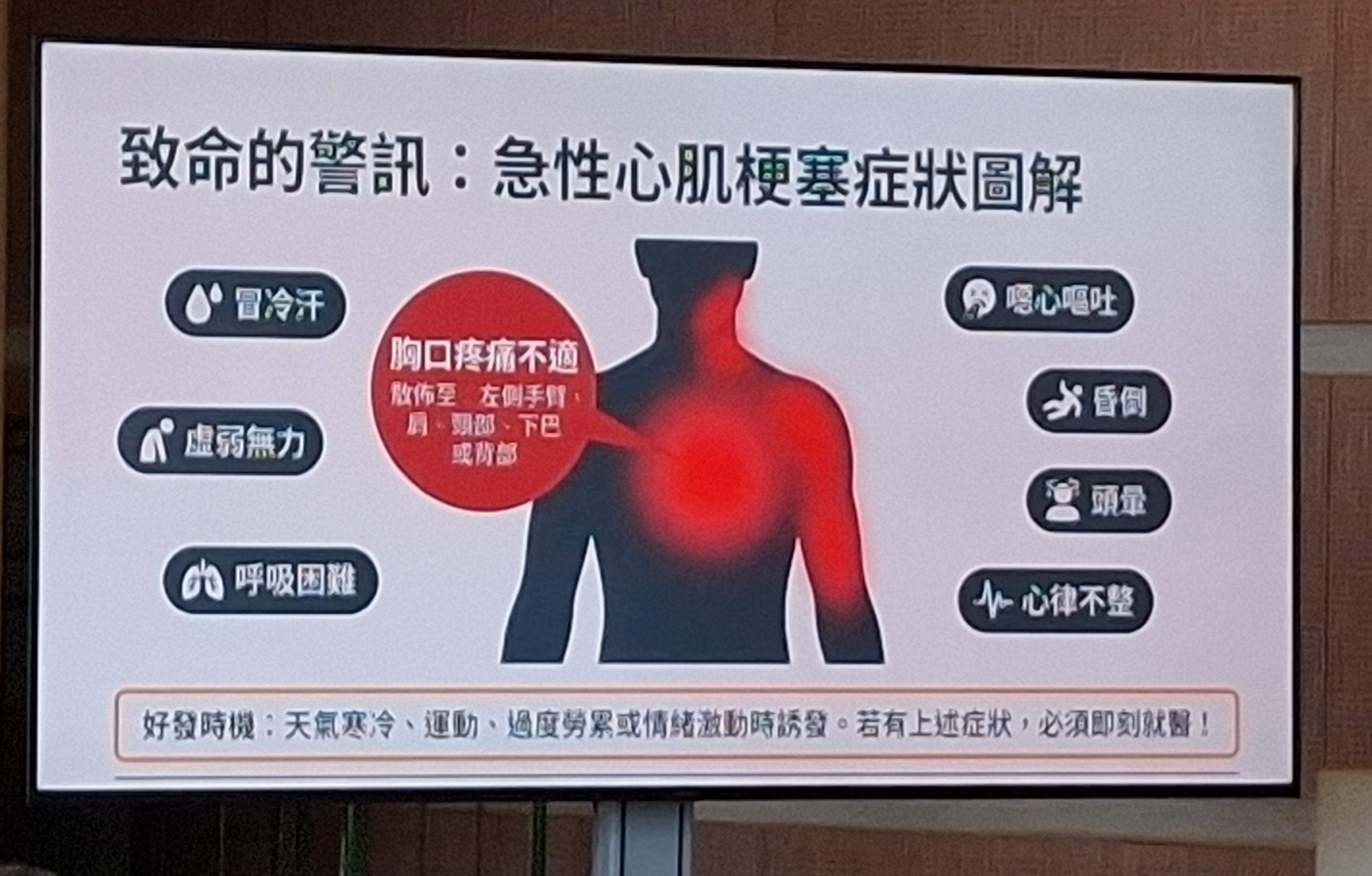 李醫師指出,心肌梗塞好發年齡約在50-60歲,近年已有年輕化趨勢,抽菸、飲食高油高鹽、久坐少運動、熬夜及高工作壓力,長期下來容易導致血管硬化堵塞。心肌梗塞常見症狀包括胸悶、胸痛(持續數分鐘以上)、呼吸困難、冒冷汗、噁心嘔吐,或疼痛延伸至左肩、手臂、背部及下巴等,部分患者亦可能出現疲倦、頭暈、腹悶等不典型症狀。一旦出現疑似症狀,應立即撥打119求助,切勿自行就醫或延誤時間。
