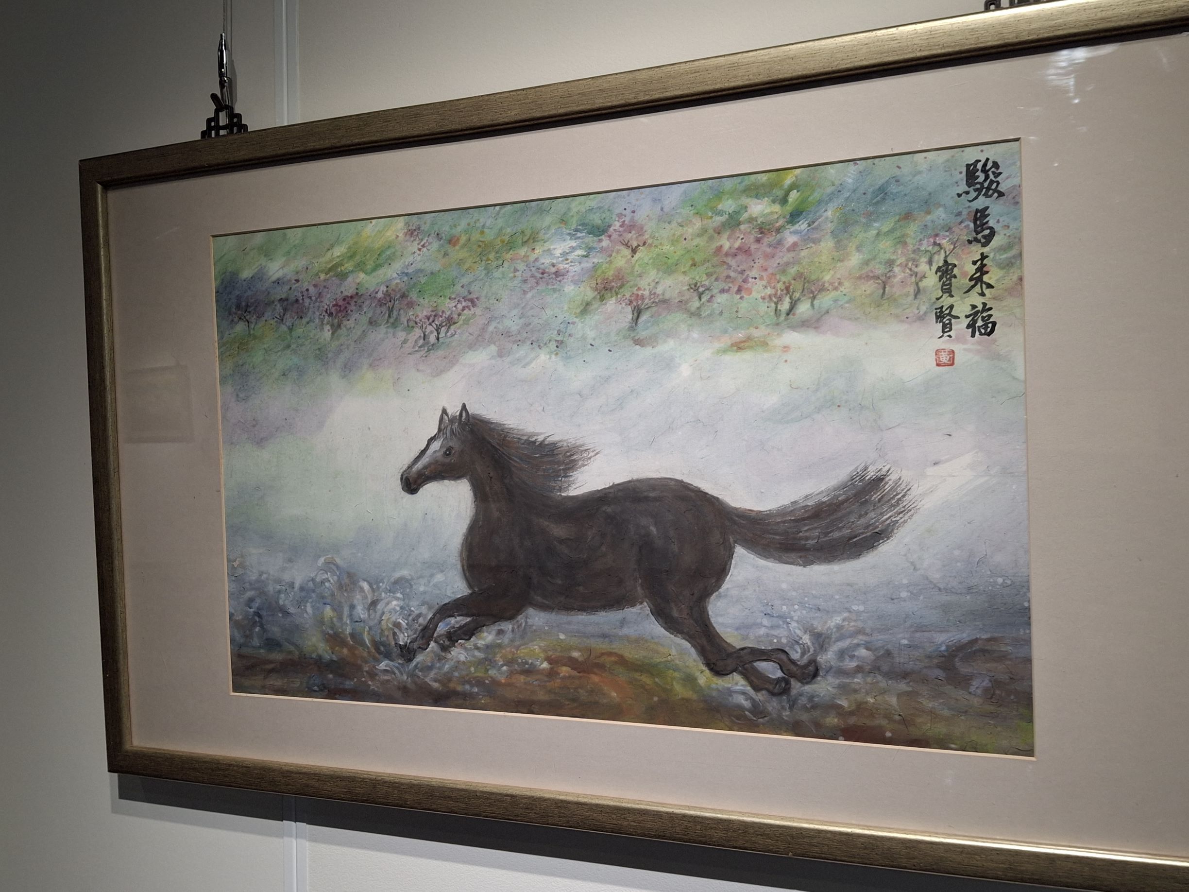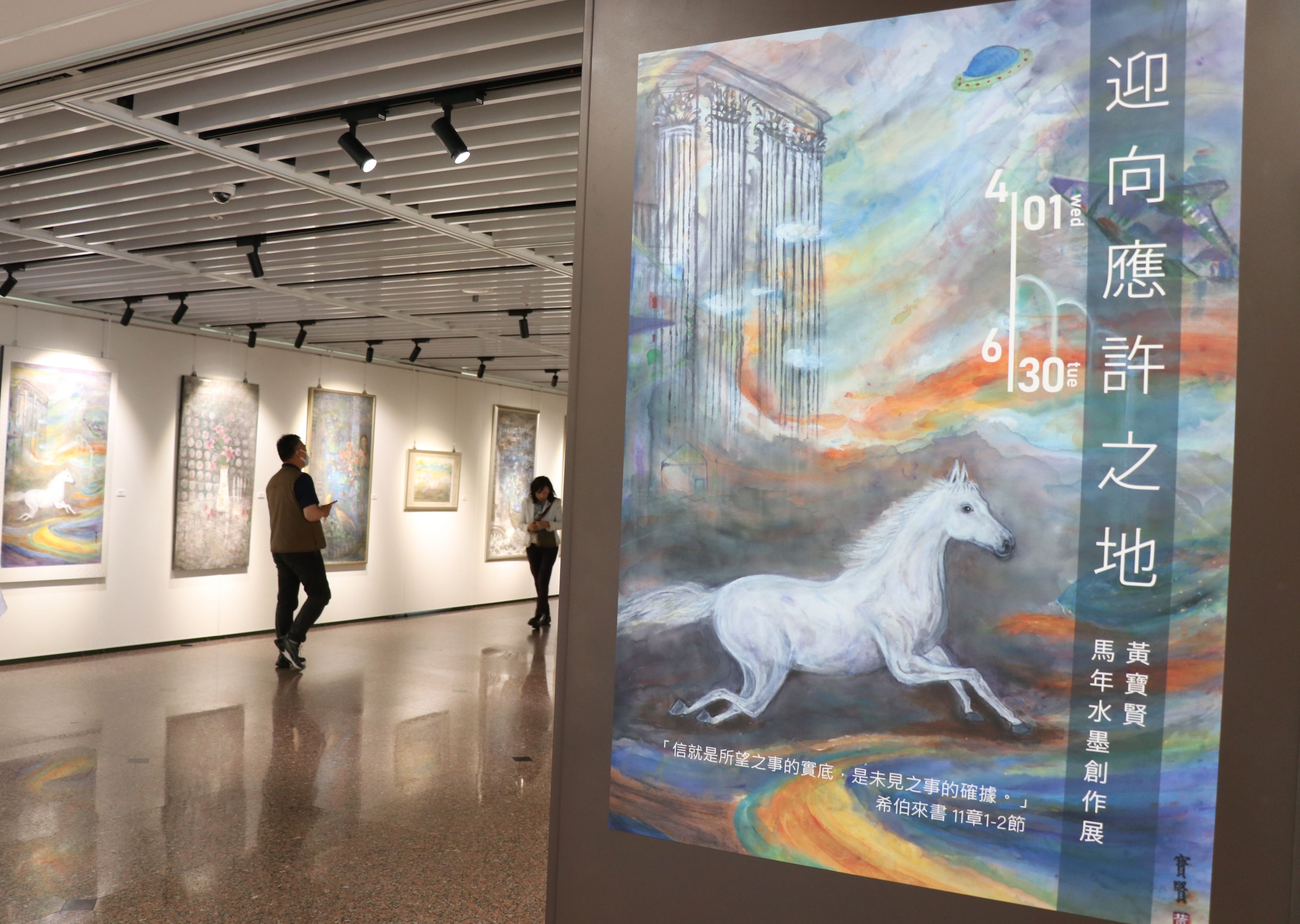 本次展覽以「盼望、信心與前行」為核心主題,靈感源自聖經希伯來書對信心的描繪,傳達即使尚未抵達終點,仍因心中懷抱應許而勇敢前行的生命態度。黃寶賢老師以「奔馬」為主要意象,將其置於山水與曠野之間,象徵人在生命歷程中持續跨越與奔跑。畫面中的馬,不僅展現力量,更象徵回應生命呼召、朝向光明不斷前進的信念,與醫院中病人努力復原、重拾希望的歷程相互呼應。