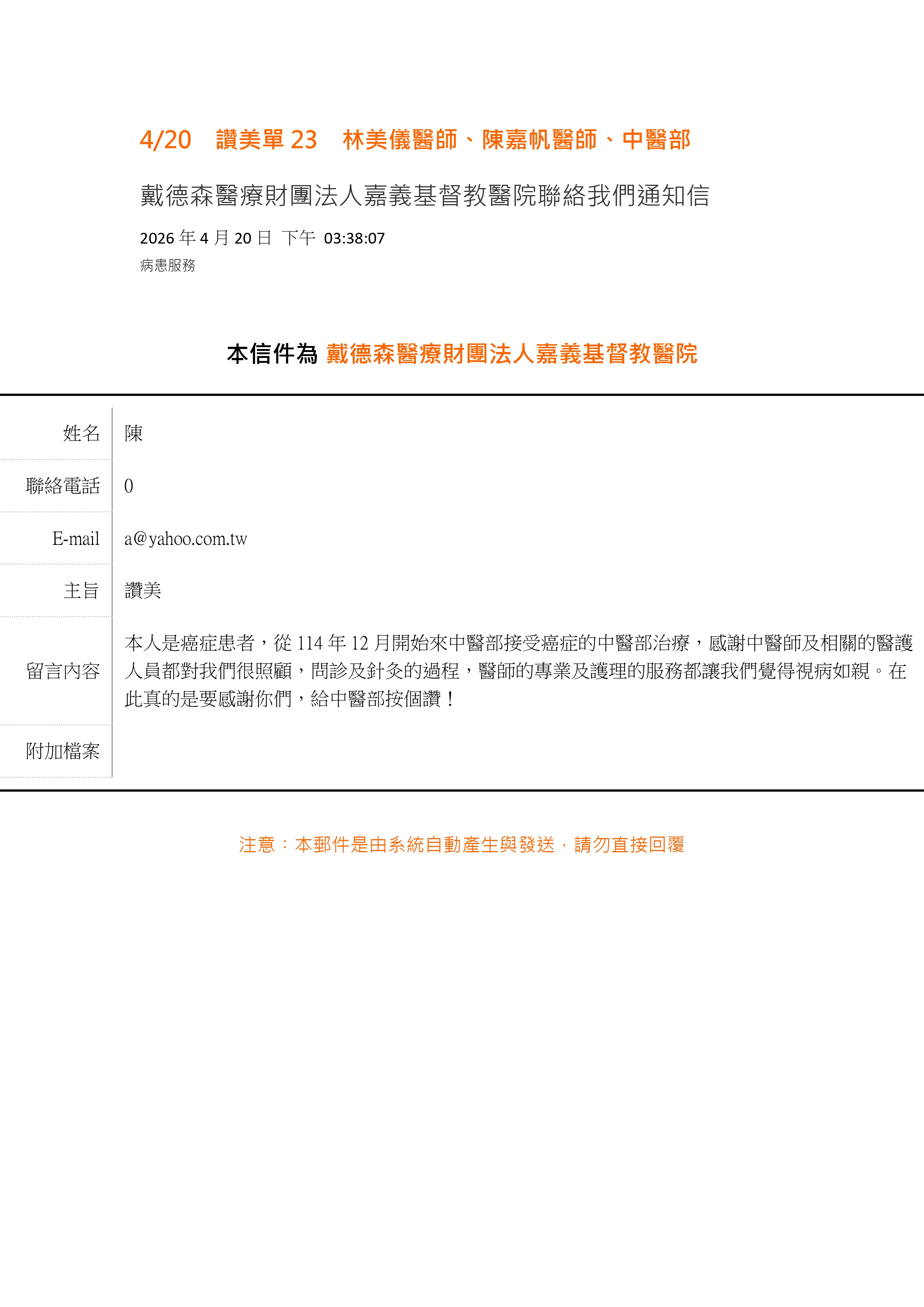 愛是永不止息- 來自家屬的肯定及感謝 嘉基 中醫部林美儀醫師【視病如親】