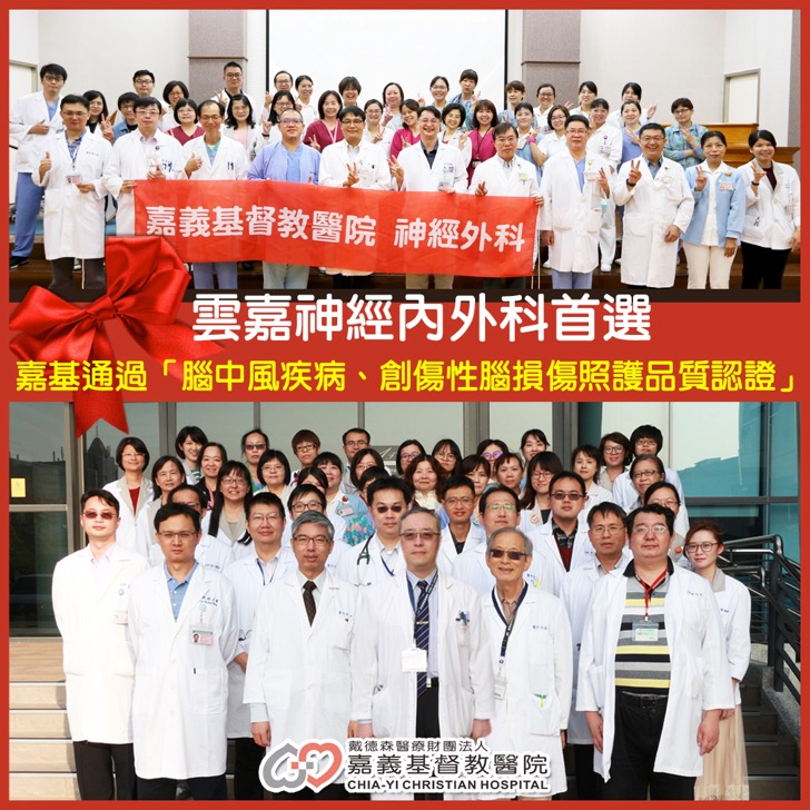 雲嘉地區為台灣65 歲以上高齡人口比率最高之區域,嘉基為提升腦中風治療品質,2007年即成立「腦中風中心」並曾以「提升急性缺血性中風照護品質」獲得醫策會「醫療品質改善突破系列貢獻獎」、「最佳標竿團隊」;在腦中風的急性治療到急性後期照護,皆獲得SNQ 國家品質標章的肯定,並且在2018年榮獲衛生福利部「組合式照護品質績優獎」。
