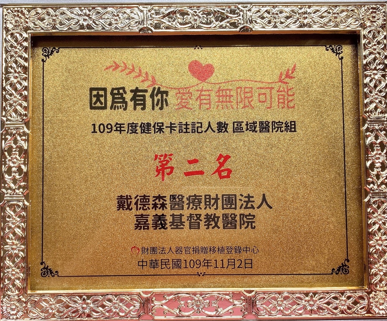 獲頒區域醫院組健保卡器捐意願註記第二名