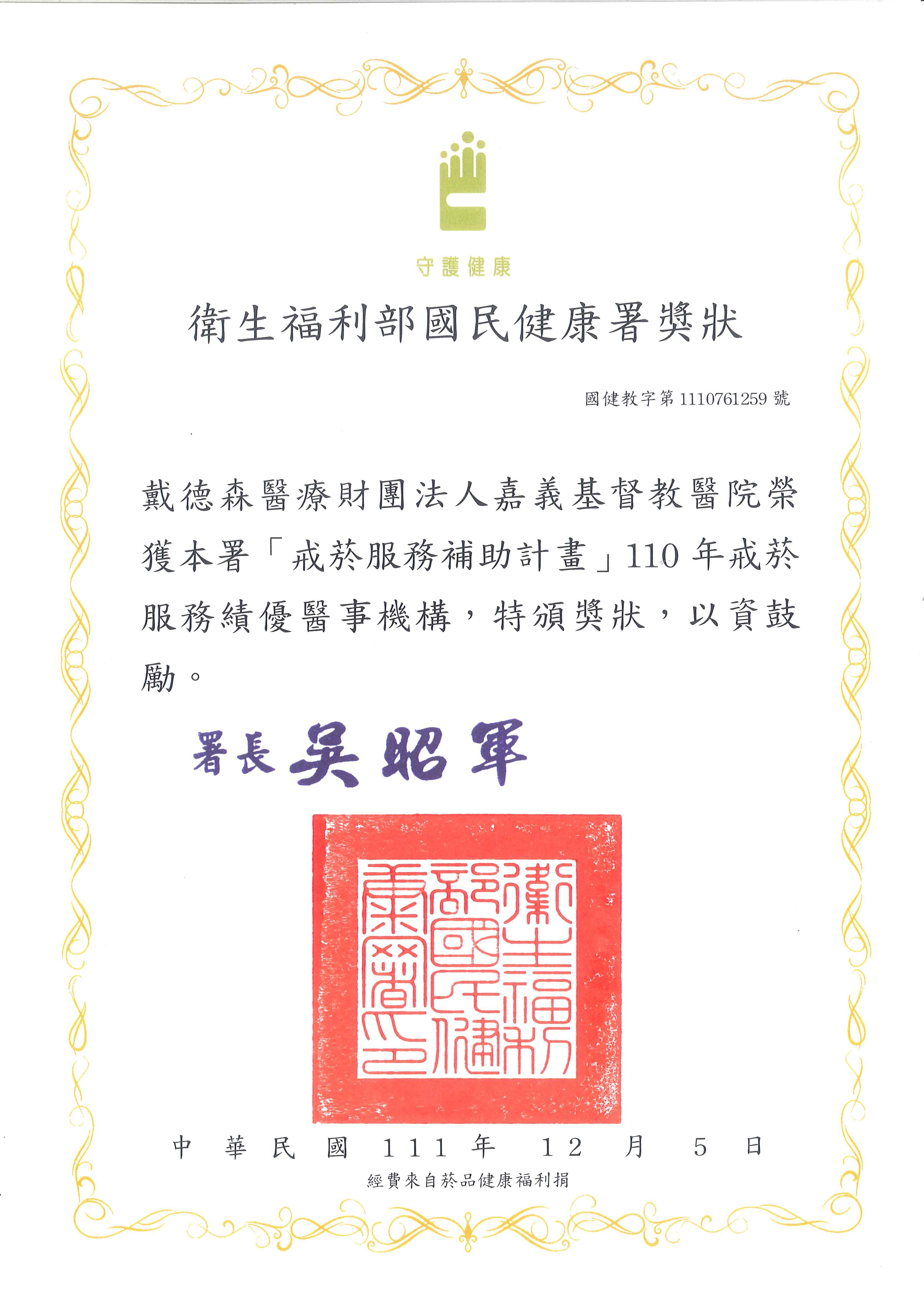 賀!本院榮獲2021年國民健康署「戒菸服務補助計畫」績優醫事機構