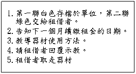 註:1.物品歸還以前,必須清洗乾淨,若有毀損,酌扣押金費。