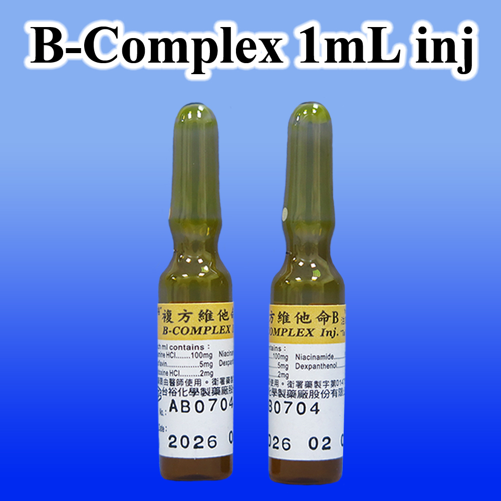 每安瓿1ml,含Nicotinamide 50mg、Thiamine HCl (Vit. B1) 100mg、Riboflavin 5mg、Pyridoxine HCl 2mg、Dexpanthenol 5mg