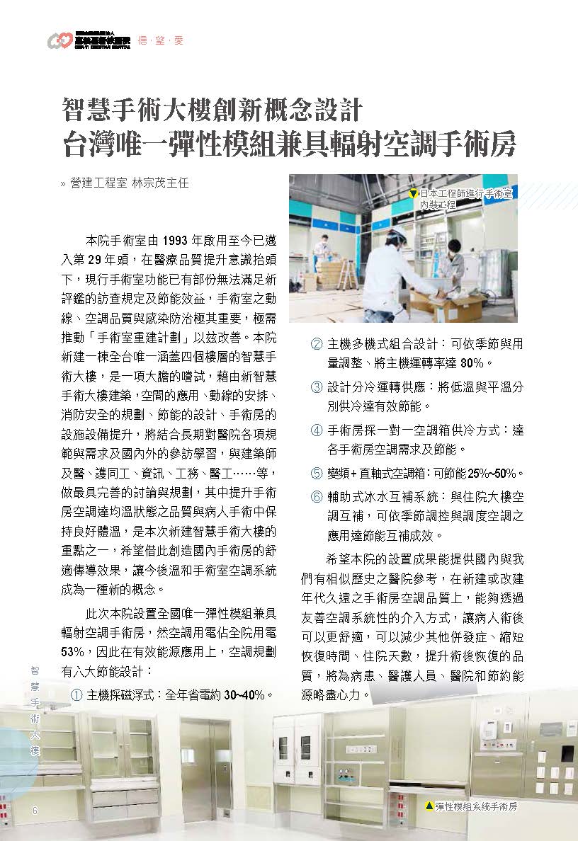 本院手術室由1993年啟用至今已邁入第29年頭,在醫療品質提升意識抬頭下,現行手術室功能已有部份無法滿足新評鑑的訪查規定及節能效益,手術室之動線、空調品質與感染防治極其重要,極需推動「手術室重建計劃」以玆改善。本院新建一棟全台唯一涵蓋四個樓層的智慧手術大樓,是一項大膽的嚐試,藉由新智慧手術大樓建築,空間的應用、動線的安排、消防安全的規劃、節能的設計、手術房的設施設備提升,將結合長期對醫院各項規範與需求及國內外的參訪學習,與建築師及醫、護同工、資訊、工務、醫工……等,做最具完善的討論與規劃,其中提升手術房空調達均溫狀態之品質與病人手術中保持良好體溫,是本次新建智慧手術大樓的重點之一,希望借此創造國內手術房的舒適傳導效果,讓今後溫和手術室空調系統成為一種新的概念。