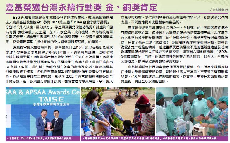 ESG 永續發展議題近年來廣受各界關注與重視,戴德森醫療財團法人嘉義基督教醫院今年參與2023 第三屆「TSAA 台灣永續行動獎」,分別以「受人以漁,婦幼共好」- 孕產婦及嬰兒保健功能提升計畫及「因為有愛 篩檢無礙」之主題,在185 家企業、政府機關、大專院校等單位報名參賽,總參賽件數達到321 件的激烈競爭中,榮獲金獎及銅獎肯定,充分體現嘉基「提供優質的全人關懷與醫療照護」的願景。