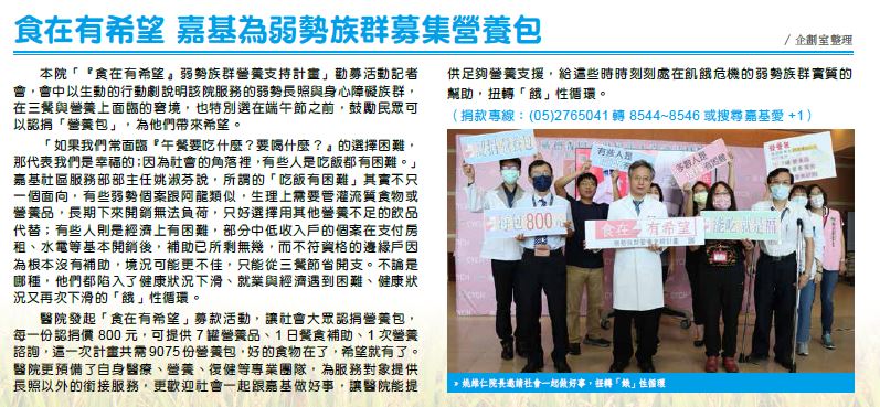 諮詢,這一次計畫共需9075 份營養包,好的食物在了,希望就有了。醫院更預備了自身醫療、營養、復健等專業團隊,為服務對象提供長照以外的銜接服務,更歡迎社會一起跟嘉基做好事,讓醫院能提供足夠營養支援,給這些時時刻刻處在飢餓危機的弱勢族群實質的幫助,扭轉「餓」性循環。
