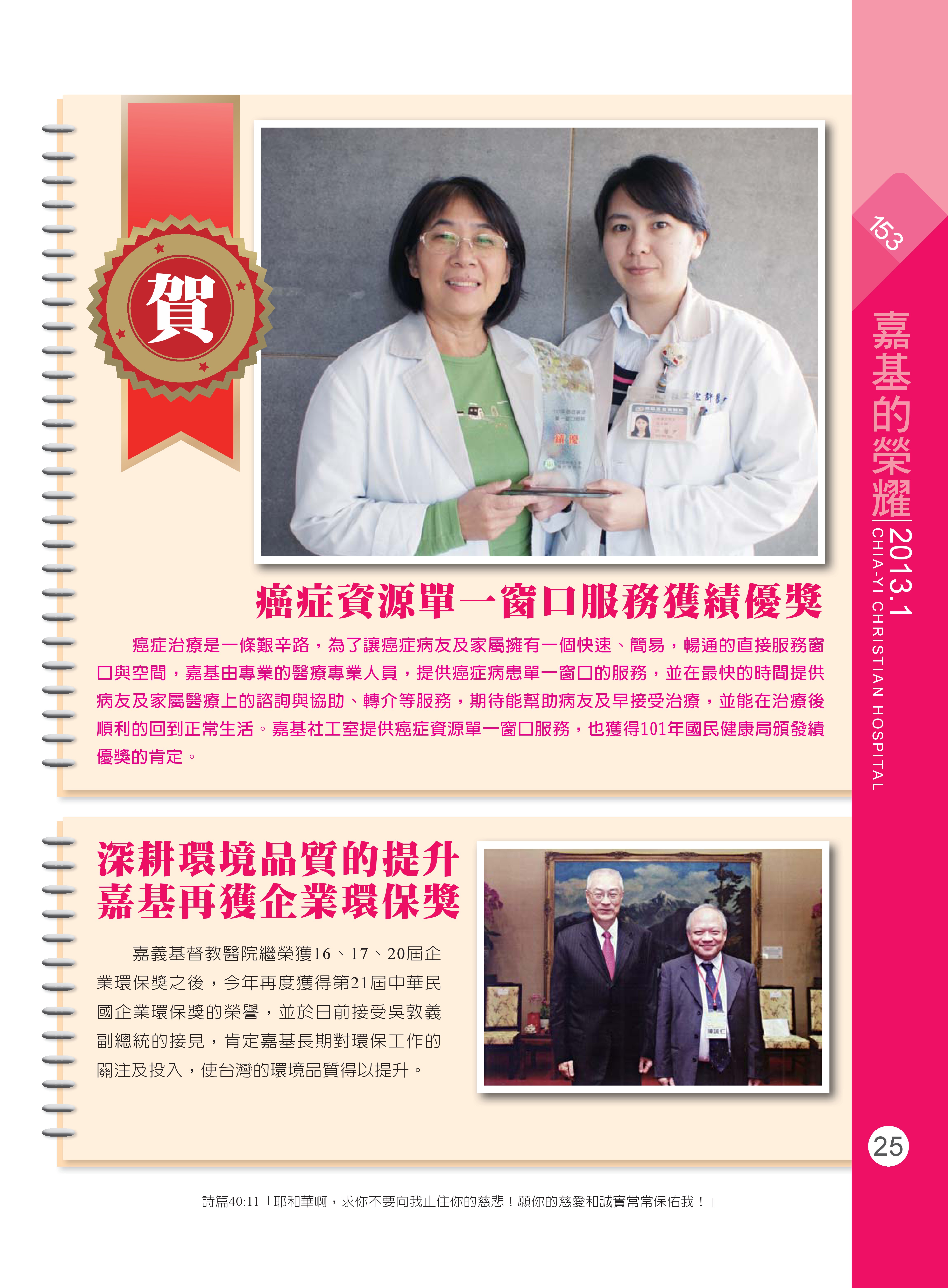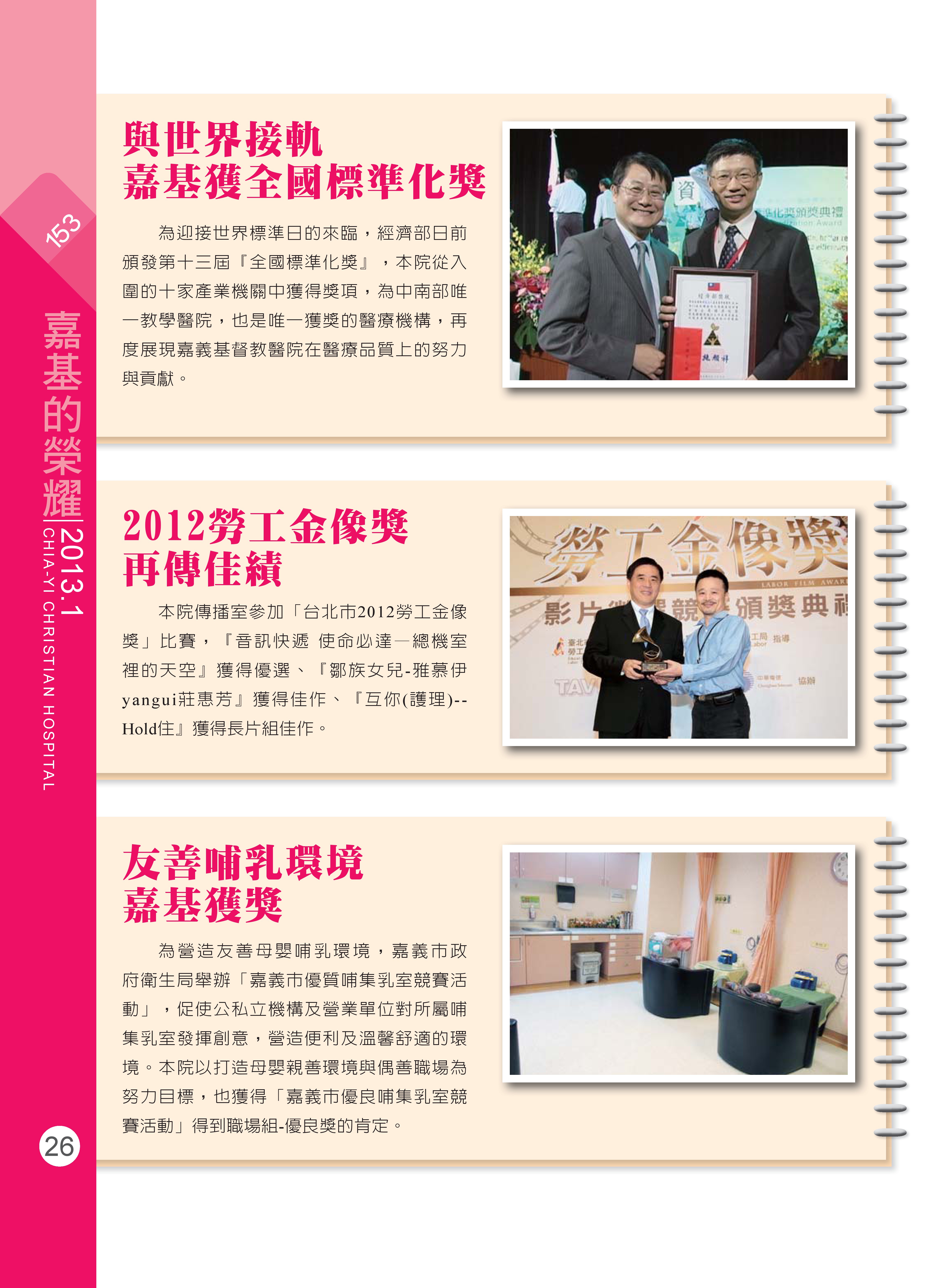 癌症資源單一窗口服務獲績優獎/深耕環境品質的提升 嘉基再獲企業環保獎/與世界接軌 嘉基獲全國標準化獎/2012勞工金像獎 再傳佳績/友善哺乳環境 嘉基獲獎