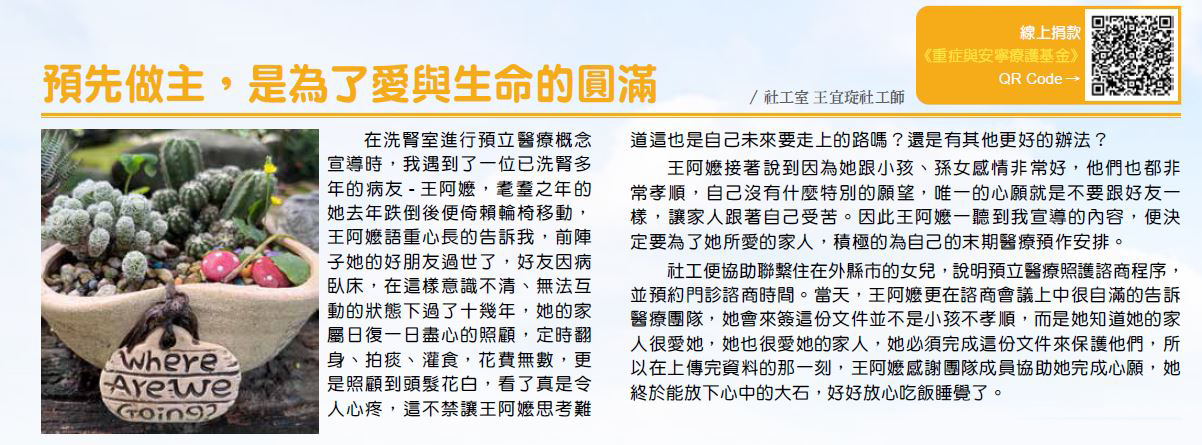 在洗腎室進行預立醫療概念宣導時,我遇到了一位已洗腎多年的病友-王阿嬤,耄耋之年的她去年跌倒後便倚賴輪椅移動,王阿嬤語重心長的告訴我,前陣子她的好朋友過世了,好友因病臥床,在這樣意識不清、無法互動的狀態下過了十幾年,她的家屬日復一日盡心的照顧,定時翻身、拍痰、灌食,花費無數,更是照顧到頭髮花白,看了真是令人心疼,這不禁讓王阿嬤思考難道這也是自己未來要走上的路嗎?還是有其他更好的辦法?