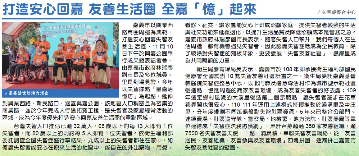 嘉義市以興業西路商圈周邊為典範,打造安心回嘉失智友善生活圈, 11月10日下午於興嘉公園舉行成果發表記者會,由嘉義市政府林瑞彥副市長及多位議員、里長到場見證,今年以失智據點「星嘉活憶坊」為起點,延伸到興業西路、新民路口,涵蓋興嘉公園,該地區人口稠密且為密集的商業區,並於今年完成人行道拓寬工程,是失智者及家屬經常活動的區域,成為今年度優先打造安心回嘉友善生活圈的重點區域。