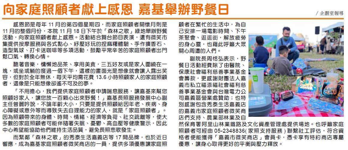 感恩節是每年11月的第四個星期四,而家庭照顧者關懷月則是11月的整個月份,本院11月18日下午於「森林之歌」綠地舉辦野餐活動,向家庭照顧者獻上感恩。活動結合舞台節目表演,還有微笑市集提供按摩服務與各式點心、紓壓好玩的捏麻糬體驗、手作擴香石、造型氣球、打卡送咖啡等多項活動,鼓勵平常辛苦的家庭照顧者出門鬆口氣、轉換心情。