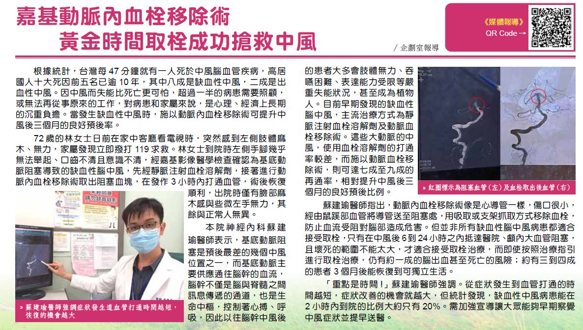 嘉基動脈內血栓移除術 黃金時間取栓成功搶救中風