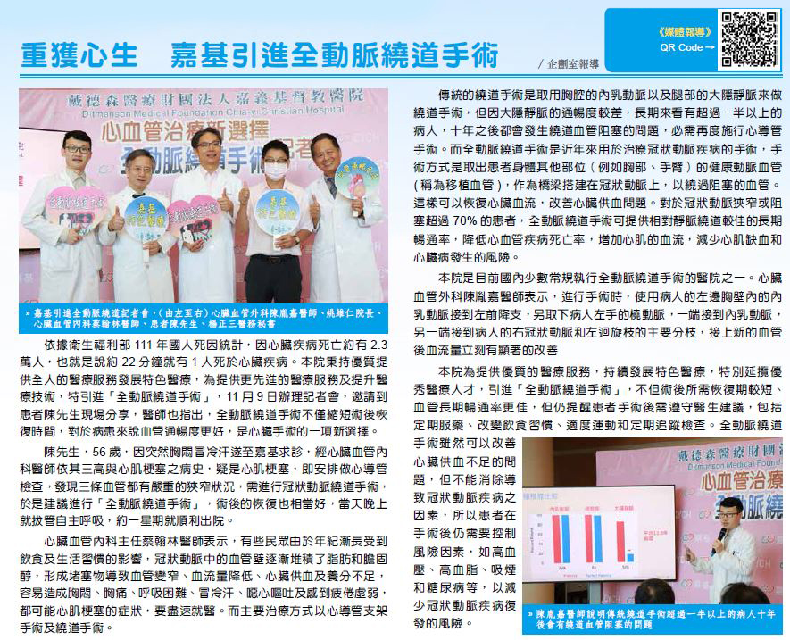 依據衛生福利部111年國人死因統計,因心臟疾病死亡約有2.3萬人,也就是說約22分鐘就有1人死於心臟疾病,嘉義基督教醫院秉持優質提供全人的醫療服務發展特色醫療,為提供更先進的醫療服務及提升醫療技術,特引進「全動脈繞道手術」, 11月9日辦理記者會,邀請到患者陳先生現場分享,醫師也指出,全動脈繞道手術不僅縮短術後恢復時間,對於病患來說血管通暢度更好,是心臟手術的一項新選擇。