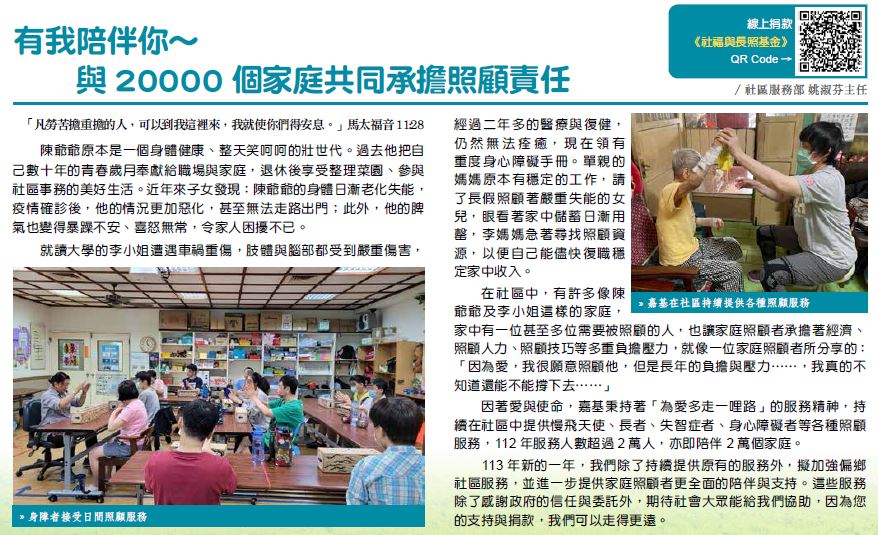 因著愛與使命,嘉基秉持著「為愛多走一哩路」的服務精神,持續在社區中提供慢飛天使、長者、失智症者、身心障礙者等各種照顧服務,112年服務人數超過2萬人,亦即陪伴2萬個家庭。