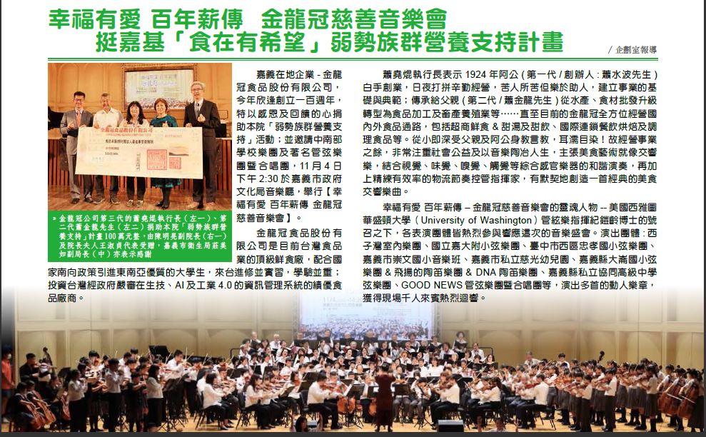 嘉義在地企業-金龍冠食品股份有限公司,今年欣逢創立一百週年,特以感恩及回饋的心捐助本院「弱勢族群營養支持」活動;並邀請中南部學校樂團及著名管弦樂團暨合唱團,11月4日下午2:30於嘉義市政府文化局音樂廳,舉行【幸福有愛 百年薪傳 金龍冠慈善音樂會】。