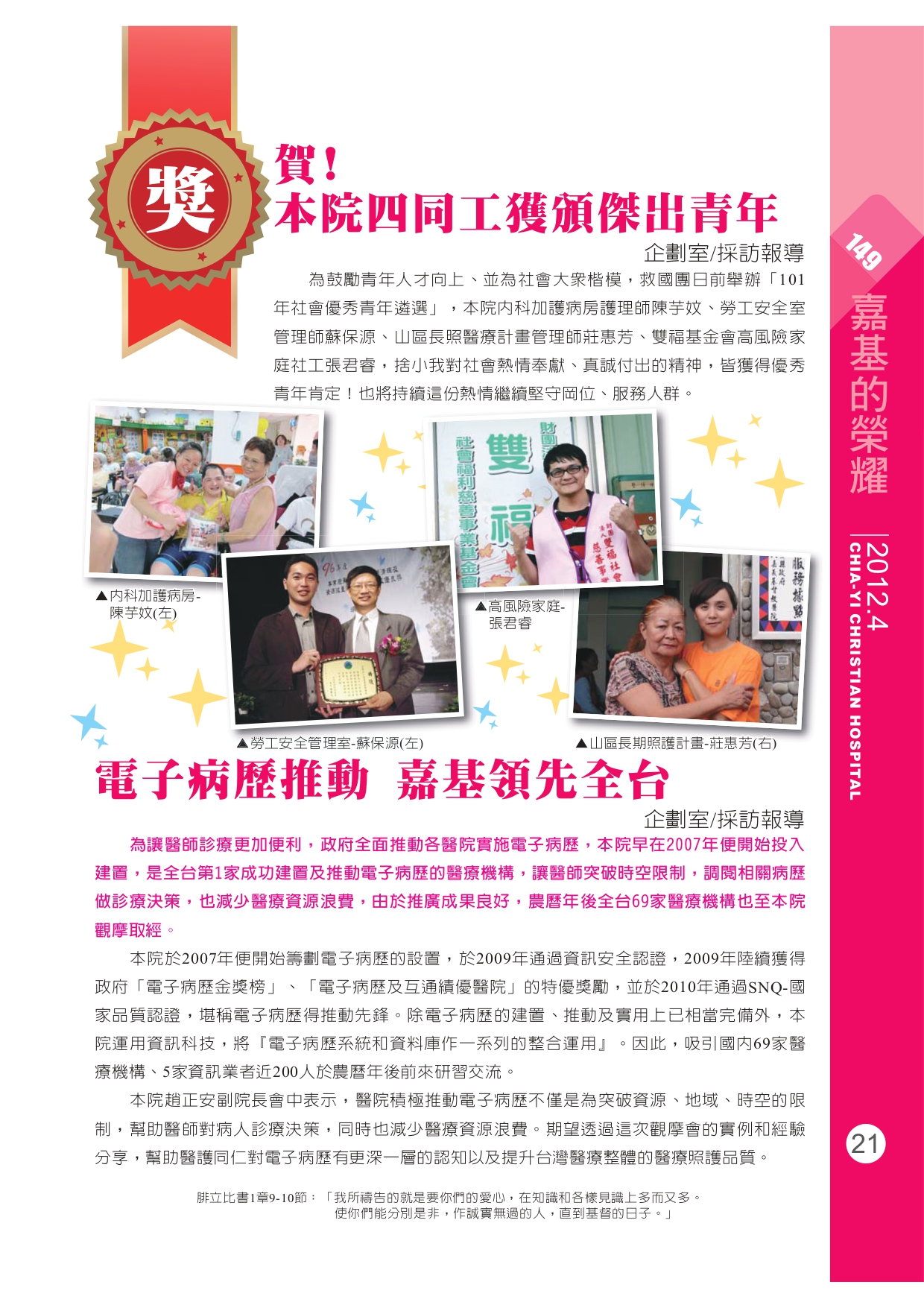 賀!本院四同工獲頒傑出青年/電子病歷推動 嘉基領先全台