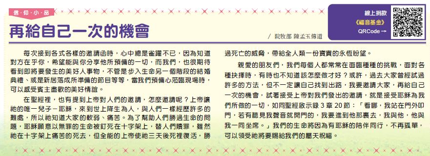 看到即將要發生的美好人事物,不管是步入生命另一個階段的結婚典禮、或是新居落成所準備的節目等等,當我們預備心蒞臨現場時,可以感受賓主盡歡的美好情誼。 在聖經裡,也有提到上帝對人們的邀請,怎麼邀請呢? 上帝讓祂的唯一兒子-耶穌,來到世上降生為人,與人們一樣經歷許多的難處,所以祂知道大家的軟弱、痛苦。為了幫助人們勝過生命的問題,耶穌願意以無罪的生命被釘死在十字架上,替人們贖罪,雖然祂在十字架上痛苦的死去,但全能的上帝使祂三天後死裡復活,勝過死亡的威脅,帶給全人類一份寶貴的永恆盼望。 親愛的朋友們,我們每個人都常常在面臨種種的挑戰,面對各種抉擇時,有時也不知道該怎麼做才好? 或許,過去大家曾經試過許多的方法,但不一定讓自己找到出路,我要邀請大家,再給自己一次的機會,試著接受上帝對我們發出的邀請,就是接受耶穌為我們所做的一切,如同聖經啟示錄3 章20 節:「看哪,我站在門外叩門,若有聽見我聲音就開門的,我要進到他那裏去,我與他,他與我一同坐席。」我們的生命將因為有耶穌的陪伴同行,不再孤單,可以領受祂將要賜給我們的屬天祝福。