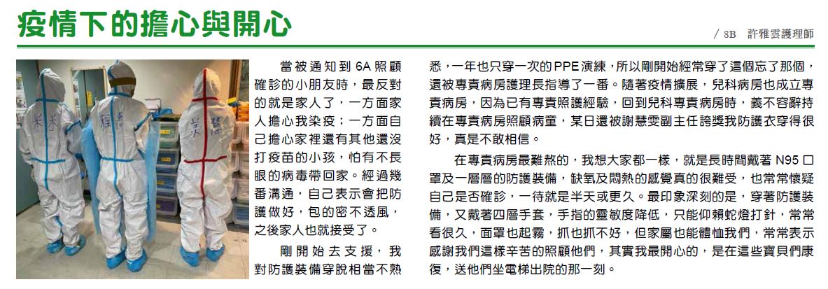 續在專責病房照顧病童,某日還被謝慧雯副主任誇獎我防護衣穿得很
