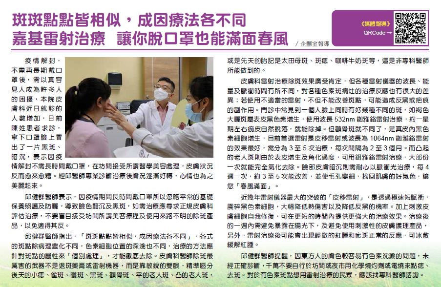疫情解封,不需再長期戴口罩後, 需以真容見人成為許多人的困擾, 本院皮膚科近日就診的人數增加, 日前陳姓患者求診,拿下口罩臉上冒出了一片黑斑、暗沉, 表示因疫情解封不需長時間戴口罩,在坊間接受所謂醫學美容處理,皮膚狀況反而愈來愈糟。經邱醫師專業診斷治療後膚況逐漸好轉,心情也為之美麗起來。 邱健群醫師表示,因疫情期間長時間戴口罩所以忽略平常的基礎保養照護及防曬,導致臉色黯沉及黑斑,如需治療應尋求正規皮膚科評估治療,不要盲目接受坊間所謂美容療程及使用來路不明的除斑產品,以免適得其反。邱健群醫師指出,「斑斑點點皆相似,成因療法各不同」,各式的斑點除病理變化不同,色素細胞位置的深淺也不同,治療的方法應針對斑點的屬性來「個別處理」,才能徹底去除。皮膚科醫師除斑最厲害的武器不是退斑藥膏或雷射機器,而是靠敏銳的雙眼,精準區分後天的小痣、雀斑、曬斑、黑斑、顴骨斑、平的老人斑、凸的老人斑,或是先天的胎記是太田母斑、斑痣、咖啡牛奶斑等,這是非專科醫師所能做到的。