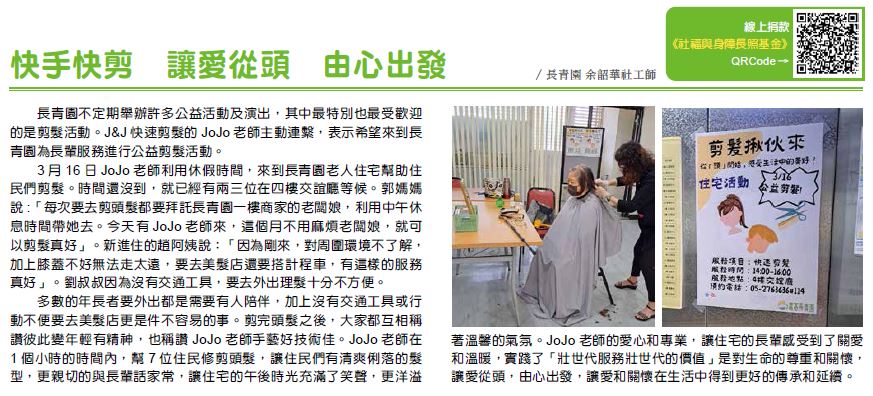 的是剪髮活動。J&J 快速剪髮的JoJo 老師主動連繫,表示希望來到長