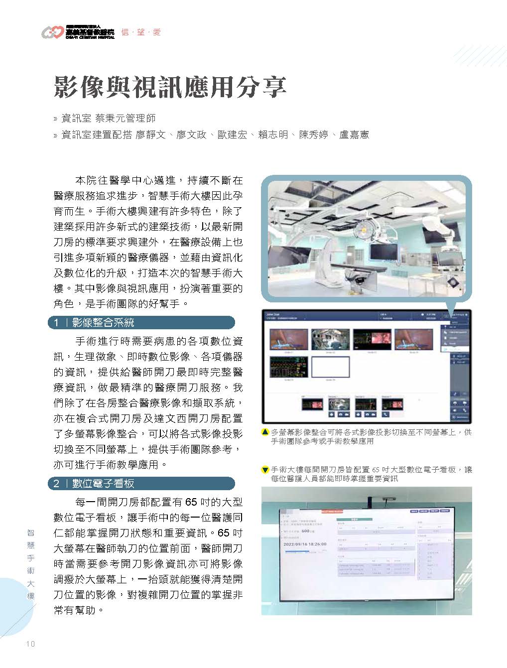 - 影像整合系統: 手術進行時需要病患的各項數位資訊,生理徵象、即時數位影像、各項儀器的資訊,提供給醫師開刀最即時完整醫療資訊,做最精準的醫療開刀服務。我們除了在各房整合醫療影像和擷取系統,亦在複合式開刀房及達文西開刀房配置了多螢幕影像整合,可以將各式影像投影切換至不同螢幕上,提供手術團隊參考,亦可進行手術教學應用。