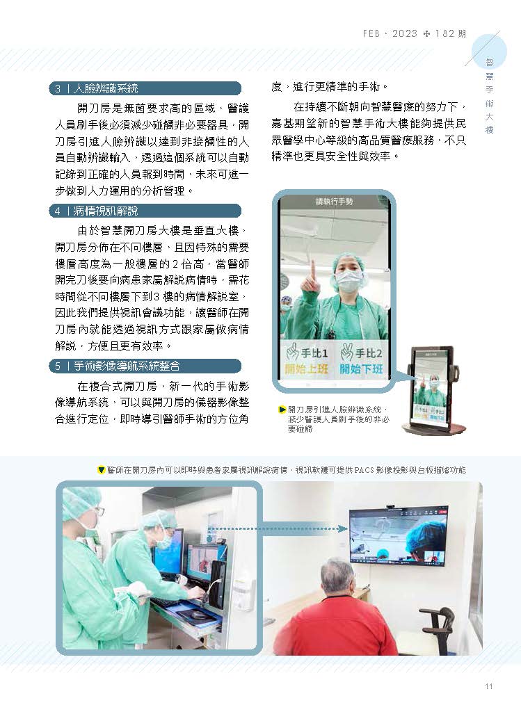 嘉義基督教醫院往醫學中心邁進,持續不斷在醫療服務追求進步,智慧手術大樓因此孕育而生,是全台灣第一棟專屬的智慧開刀房大樓。嘉基在本次手術大樓興建有許多特色,除了建築採用許多新式的建築技術,以最新開刀房的標準要求來興建,在醫療設備上也引進多項新穎的醫療儀器,並藉由資訊化及數位化的升級,打造本次的智慧手術大樓。其中影像與視訊應用,扮演著重要的角色,是手術團隊的好幫手。