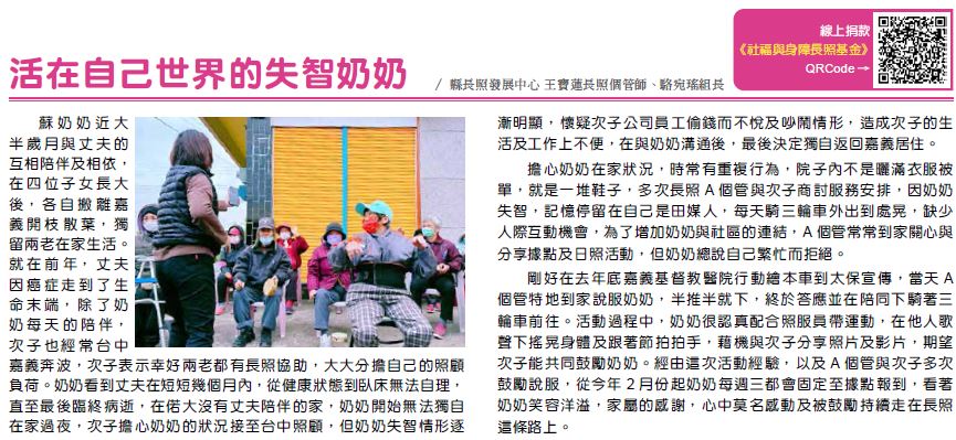 鼓勵說服,從今年2 月份起奶奶每週三都會固定至據點報到,看著
