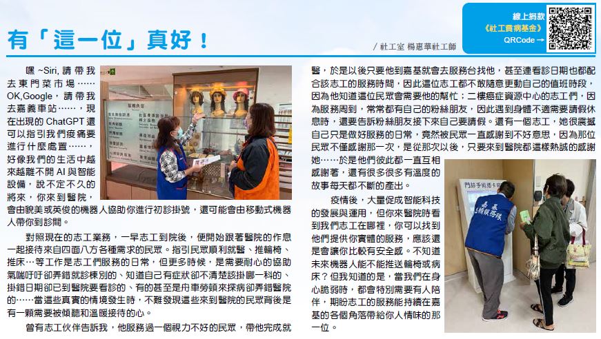 因為他知道這位民眾會需要他的幫忙;二樓癌症資源中心的志工們,因