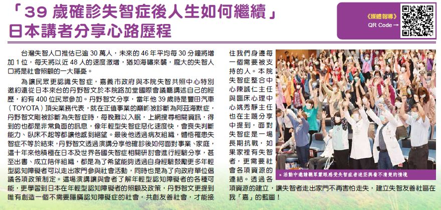 台灣失智人口推估已逾30 萬人,未來的46 年平均每30 分鐘將增加1 位,每天將以近48 人的速度激增,猶如海嘯來襲,龐大的失智人口將是社會照顧的一大隱憂。 為讓民眾更認識失智症,嘉義市政府與本院失智共照中心特別邀約遠從日本來台的丹野智文於本院路加堂國際會議廳講述自己的經歷,約有400 位民眾參加。丹野智文分享,當年他39 歲時是豐田汽車(TOYOTA)頂尖業務代表,就在正值事業的巔峰被診斷為阿茲海默症,丹野智文剛被診斷為失智症時,每晚難以入眠,上網搜尋相關資訊,得到的也都是非常負面的訊息,像年輕型失智症惡化速度快,會喪失判斷能力、臥床不起等都讓他感到絕望。最後他透過病友組織,體悟罹患失智症不等於結束,丹野智文透過演講分享他確診後如何面對事業、家庭,這十年來他積極在日本及世界各國失智症相關研討會進行經驗分享,甚至出書、成立陪伴組織,都是為了希望能夠透過自身經驗鼓勵更多年輕型認知障礙者可以走出家門參與社會活動,同時也是為了向政府單位倡議各項政策制定。這場演講讓與會者了解年輕型認知障礙者的各種可能,更學習到日本在年輕型認知障礙者的照顧及政策,丹野智文更提到唯有創造一個不需要隱瞞認知障礙症的社會,共創友善社會,才能接住我們身邊每一個需要被支持的人。本院失智症整合中心陳誠仁主任與臨床心理中心姚秀靜主任也在主題分享中提到, 面對失智症是一場長期抗戰, 如果家裡有失智者, 更需要社會各項資源的連結。透過各項資源的建立,讓失智者走出家門不再害怕走失,建立失智友善社區在我「嘉」的藍圖!