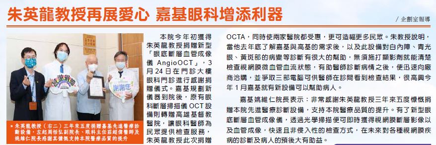 朱英龍教授再展愛心 嘉基眼科增添利器