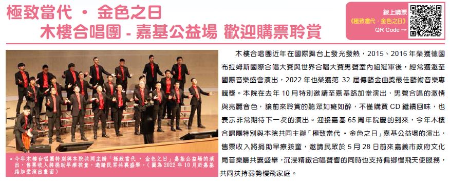 木樓合唱團近年在國際舞台上發光發熱,2015、2016 年榮獲德國布拉姆斯國際合唱大賽與世界合唱大賽男聲室內組冠軍後,經常獲邀至國際音樂盛會演出,2022 年也榮獲第 32 屆傳藝金曲獎最佳藝術音樂專輯獎。本院在去年10 月特別邀請至嘉基路加堂演出,男聲合唱的激情與亮麗音色,讓前來聆賞的聽眾如癡如醉,不僅購買CD 繼續回味,也表示非常期待下一次的演出。迎接嘉基65 周年院慶的到來,今年木樓合唱團特別與本院共同主辦「極致當代‧ 金色之日」嘉基公益場的演出,售票收入將捐助早療孩童,邀請民眾於5 月28 日前來嘉義市政府文化局音樂廳共襄盛舉,沉浸精緻合唱聲響的同時也支持偏鄉慢飛天使服務,共同扶持弱勢慢飛家庭。