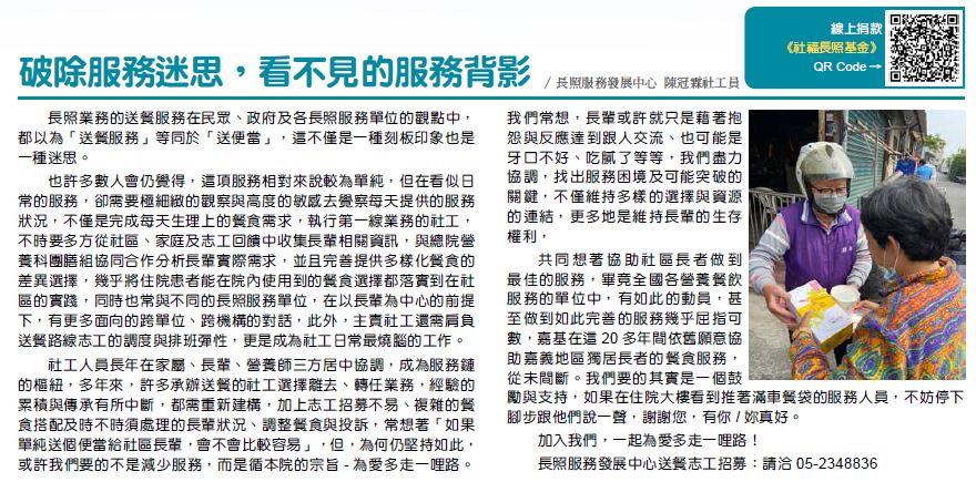 長照服務發展中心送餐志工招募:請洽05-2348836