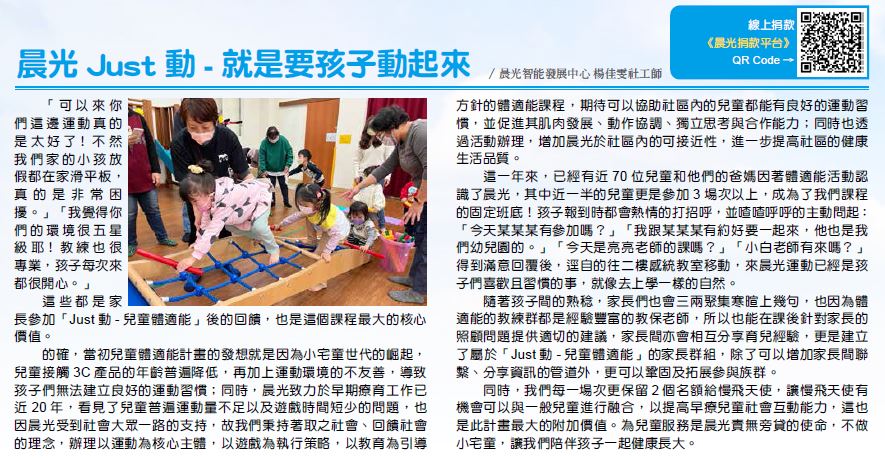 孩子們無法建立良好的運動習慣;同時,晨光致力於早期療育工作已