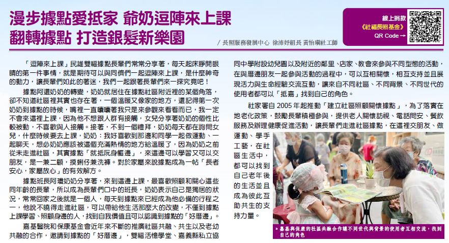 社家署自2005 年起推動「建立社區照顧關懷據點」,為了落實在地老化政策,鼓勵長輩積極參與,提供老人關懷訪視、電話問安、餐飲服務及辦理健康促進活動,讓長輩們走進社區據點,在這裡交朋友、做運動、學手工藝,在社區生活中,都可以找到自己老年後的生活並且成為彼此互助共生的支持力量。