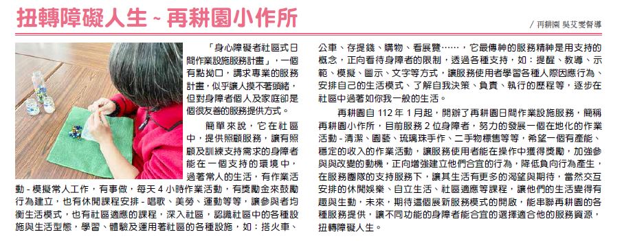 再耕園自112 年1 月起,開辦了再耕園日間作業設施服務,簡稱再耕園小作所,目前服務2 位身障者,努力的發展一個在地化的作業活動- 清潔、園藝、琉璃珠手作、二手物標售等等,希望一個有產能、穩定的收入的作業活動,讓服務使用者能在操作中獲得獎勵,加強參與及改變的動機,正向增強建立他們合宜的行為,降低負向行為產生,在服務團隊的支持服務下,讓其生活有更多的渴望與期待,當然交互安排的休閒娛樂、自立生活、社區適應等課程,讓他們的生活變得有趣與生動,未來,期待這個展新服務模式的開啟,能串聯再耕園的各種服務提供,讓不同功能的身障者能合宜的選擇適合他的服務資源,扭轉障礙人生。
