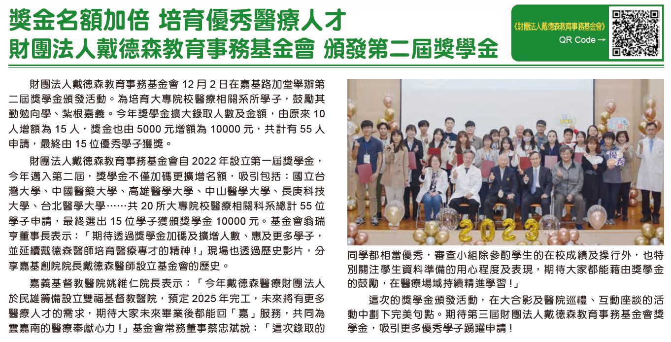 財團法人戴德森教育事務基金會12 月2 日在嘉基路加堂舉辦第二屆獎學金頒發活動。為培育大專院校醫療相關系所學子,鼓勵其