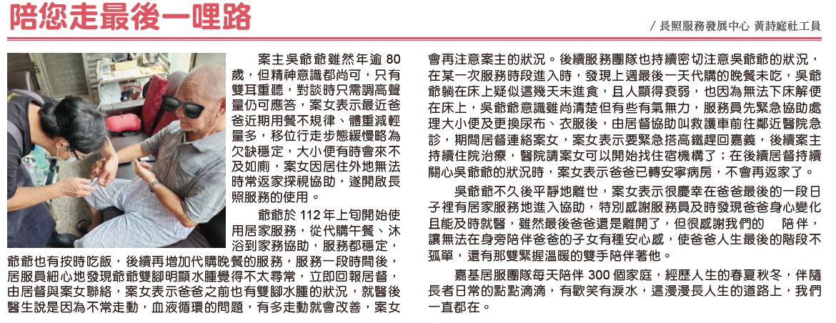 爺爺於112 年上旬開始使用居家服務,從代購午餐、沐浴到家務協助,服務都穩定,爺爺也有按時吃飯,後續再增加代購晚餐的服務,服務一段時間後,居服員細心地發現爺爺雙腳明顯水腫覺得不太尋常,立即回報居督,由居督與案女聯絡,案女表示爸爸之前也有雙腳水腫的狀況,就醫後醫生說是因為不常走動,血液循環的問題,有多走動就會改善,案女會再注意案主的狀況。後續服務團隊也持續密切注意吳爺爺的狀況,在某一次服務時段進入時,發現上週最後一天代購的晚餐未吃,吳爺爺躺在床上疑似這幾天未進食,且人顯得衰弱,也因為無法下床解便在床上,吳爺爺意識雖尚清楚但有些有氣無力,服務員先緊急協助處理大小便及更換尿布、衣服後,由居督協助叫救護車前往鄰近醫院急診,期間居督連絡案女,案女表示要緊急搭高鐵趕回嘉義,後續案主持續住院治療,醫院請案女可以開始找住宿機構了;在後續居督持續關心吳爺爺的狀況時,案女表示爸爸已轉安寧病房,不會再返家了。