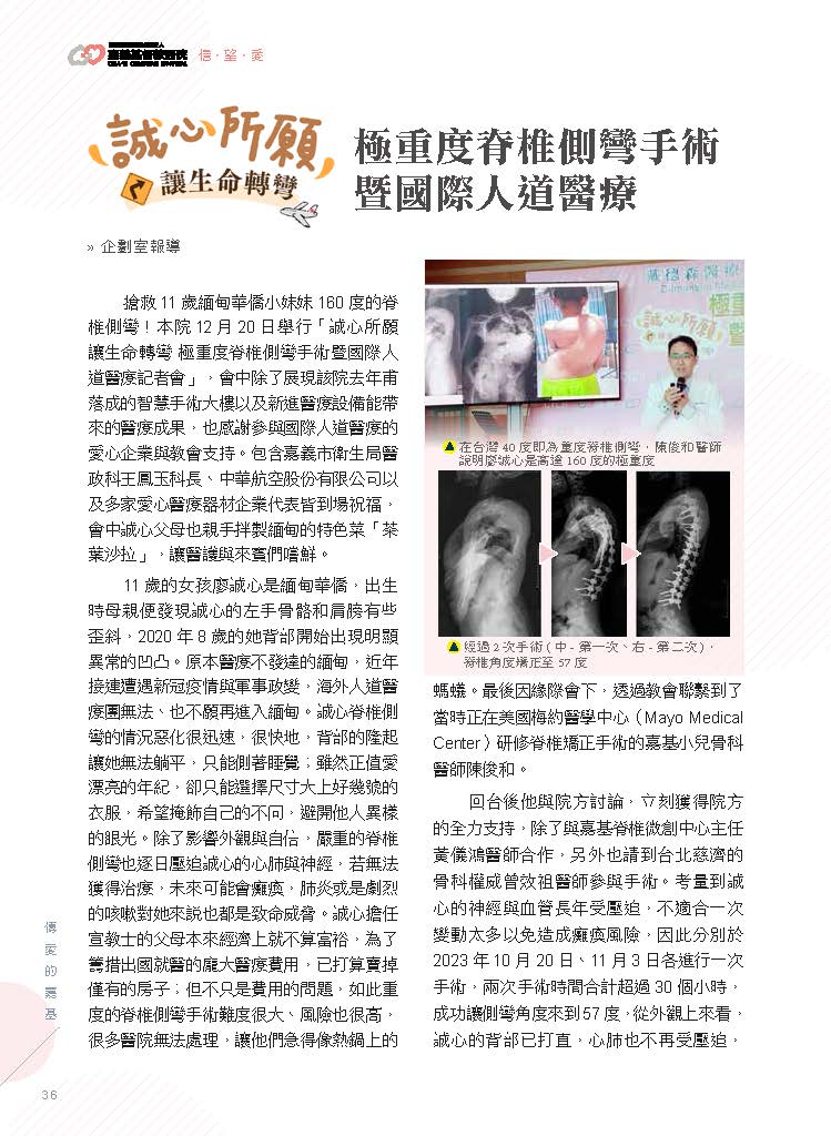 搶救11歲緬甸華僑小妹妹160度的脊椎側彎!本院12月20日舉行「誠心所願 讓生命轉彎 極重度脊椎側彎手術暨國際人道醫療記者會」,會中除了展現該院去年甫落成的智慧手術大樓以及新進醫療設備能帶來的醫療成果,也感謝參與國際人道醫療的愛心企業與教會支持。包含嘉義市衛生局醫政科王鳳玉科長、中華航空股份有限公司以及多家愛心醫療器材企業代表皆到場祝福,會中誠心父母也親手拌製緬甸的特色菜「茶葉沙拉」,讓醫護與來賓們嚐鮮。