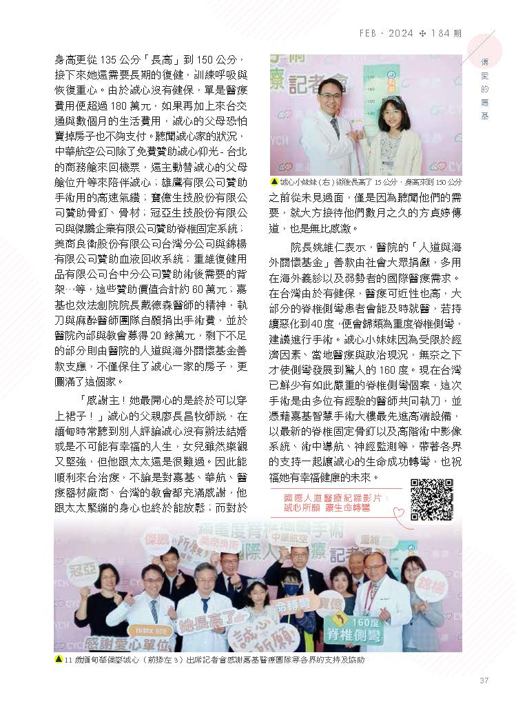 回台後他與院方討論,立刻獲得院方的全力支持,除了與嘉基脊椎微創中心主任黃儀鴻醫師合作,另外也請到台北慈濟的骨科權威曾效祖醫師參與手術。考量到誠心的神經與血管長年受壓迫,不適合一次變動太多以免造成癱瘓風險,因此分別於2023年10月20日、11月3日各進行一次手術,兩次手術時間合計超過30個小時,成功讓側彎角度來到57度,從外觀上來看,誠心的背部已打直,心肺也不再受壓迫,身高更從135公分「長高」到150公分,接下來她還需要長期的復健,訓練呼吸與恢復重心。