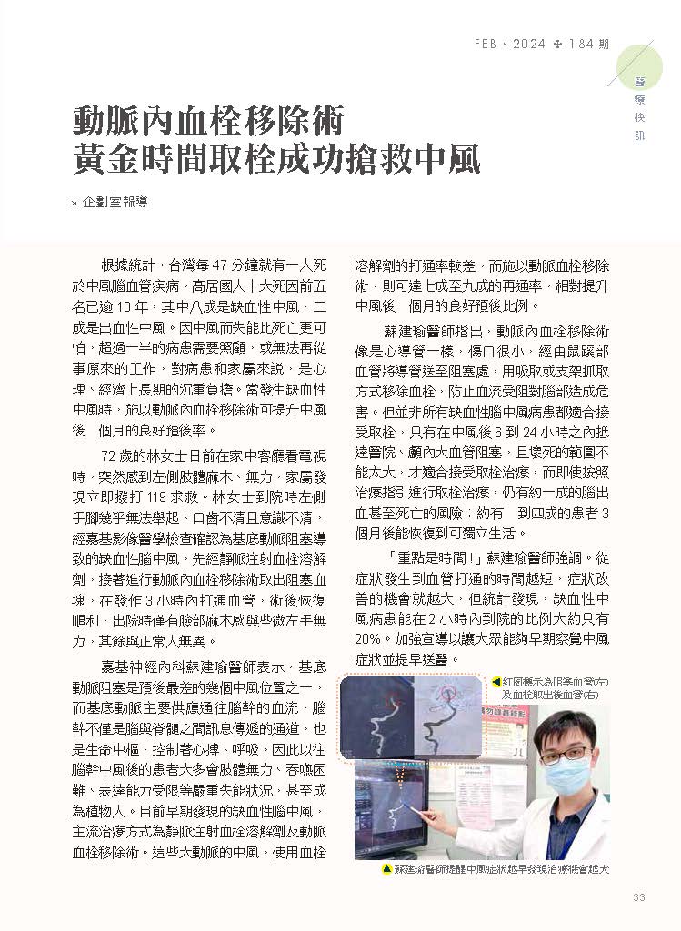 嘉基動脈內血栓移除術 黃金時間取栓成功搶救中風