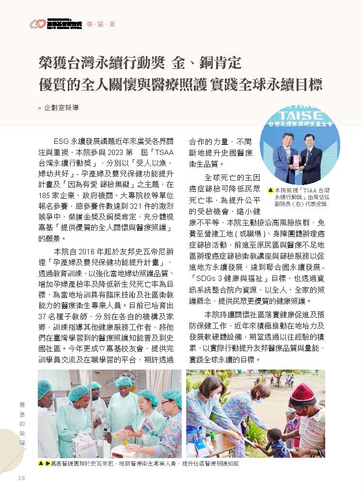 ESG永續發展議題近年來廣受各界關注與重視,本院參與2023第三屆「TSAA台灣永續行動獎」,分別以「受人以漁,婦幼共好」-孕產婦及嬰兒保健功能提升計畫及「因為有愛 篩檢無礙」之主題,在185家企業、政府機關、大專院校等單位報名參賽,總參賽件數達到321件的激烈競爭中,榮獲金獎及銅獎肯定,充分體現嘉基「提供優質的全人關懷與醫療照護」的願景。