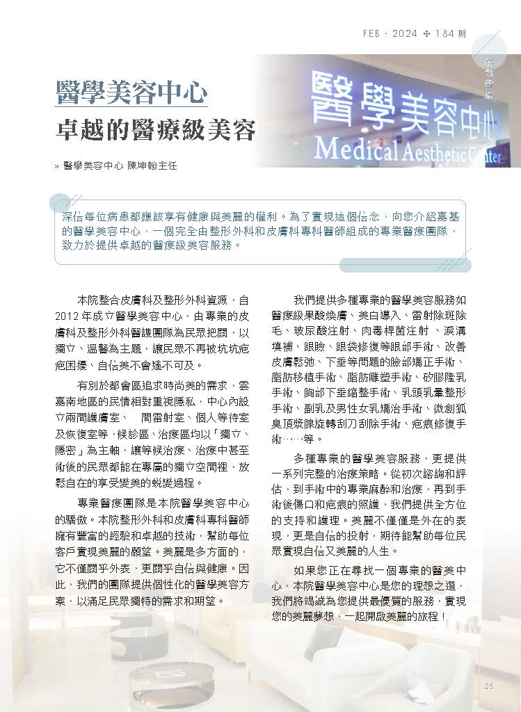 本院整合皮膚科及整形外科資源,自2012年成立醫學美容中心,由專業的皮膚科及整形外科醫謢團隊為民眾把關,以獨立、溫馨為主題,讓民眾不再被坑坑疤疤困擾、自信美不會遙不可及。